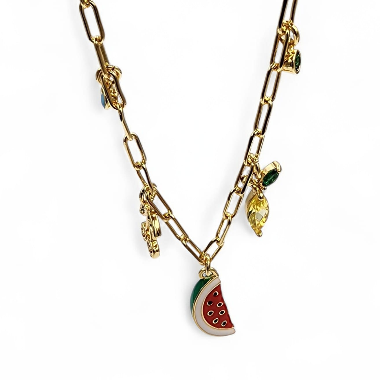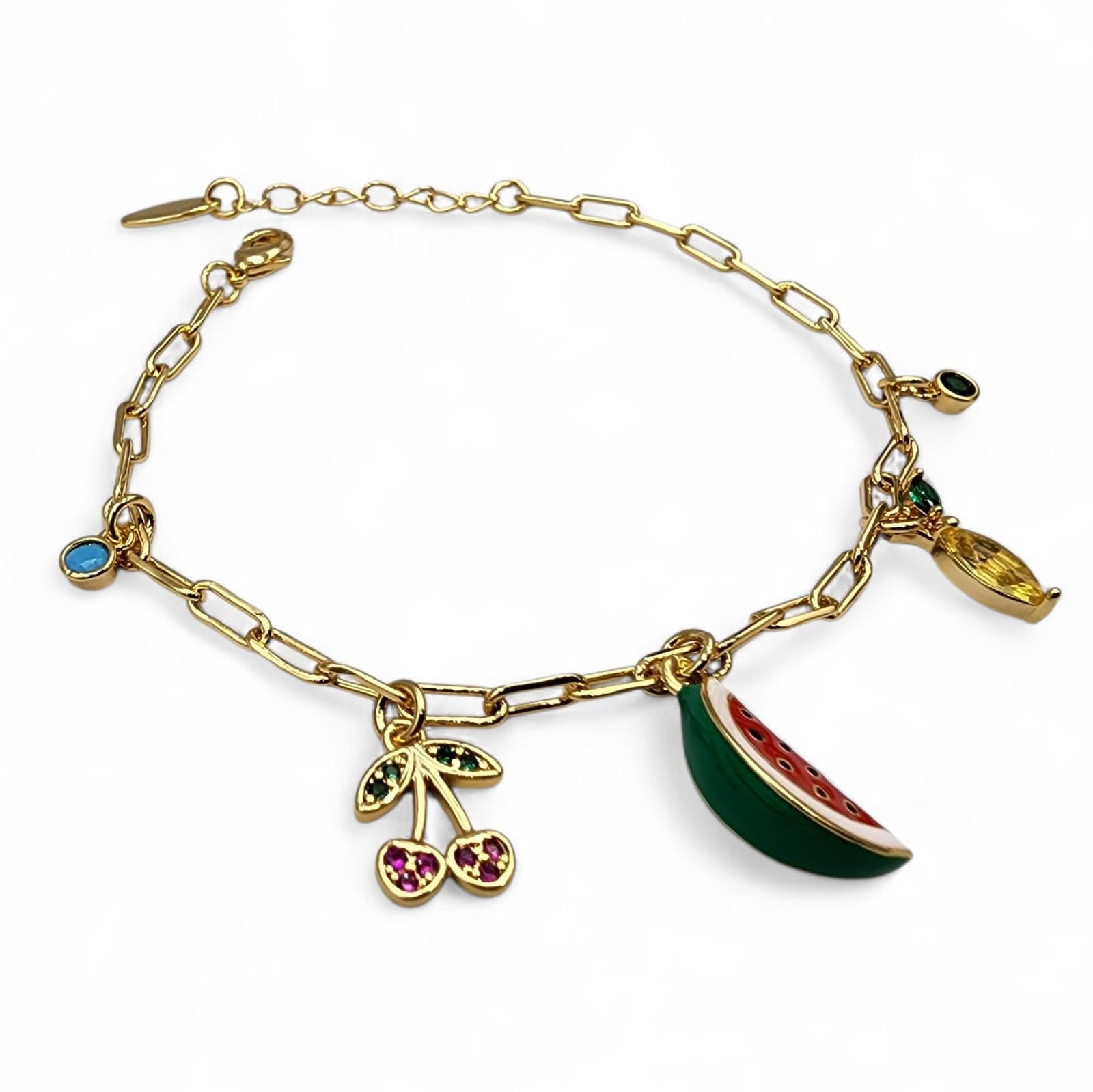 Llena tu estilo de frescura y brillo con esta pulsera única. Diseñada con dijes encantadores en forma de sandía, cereza y elegantes circonias brillantes, es el accesorio ideal para quienes disfrutan de los detalles coloridos y divertidos sin perder el toque de sofisticación.